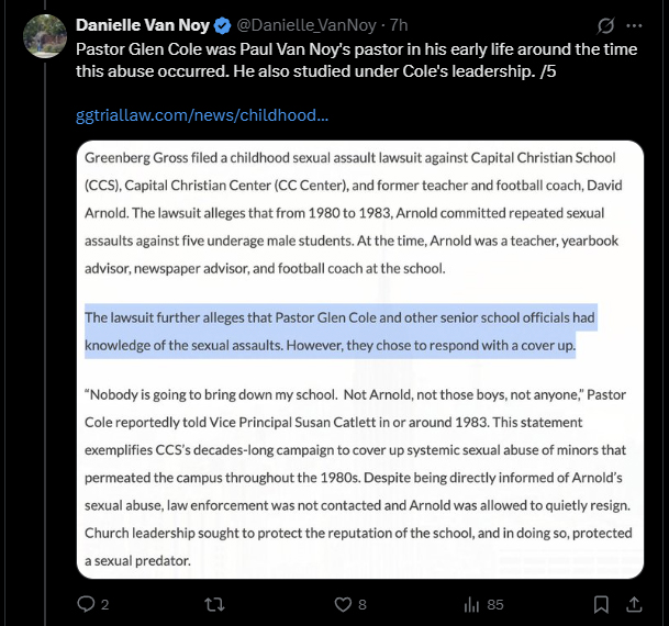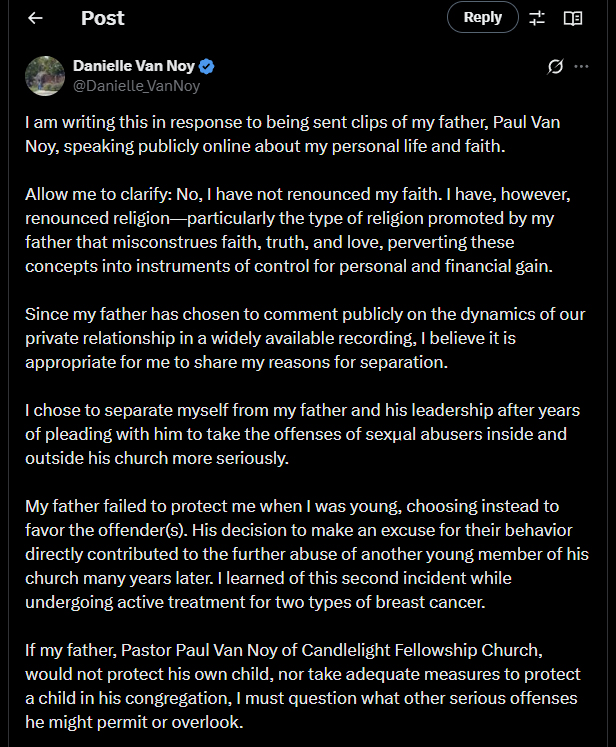 What is clear is that Danielle’s account, if accurate, represents some of the most serious concerns yet raised about leadership failures under Pastor Paul Van Noy.