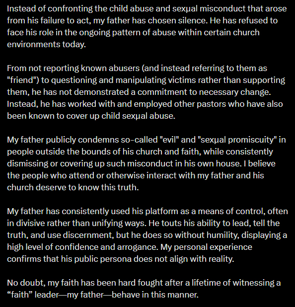 She points to documented cases or lawsuits involving these pastors or their ministries where abuse was alleged or where reporting failures were claimed.